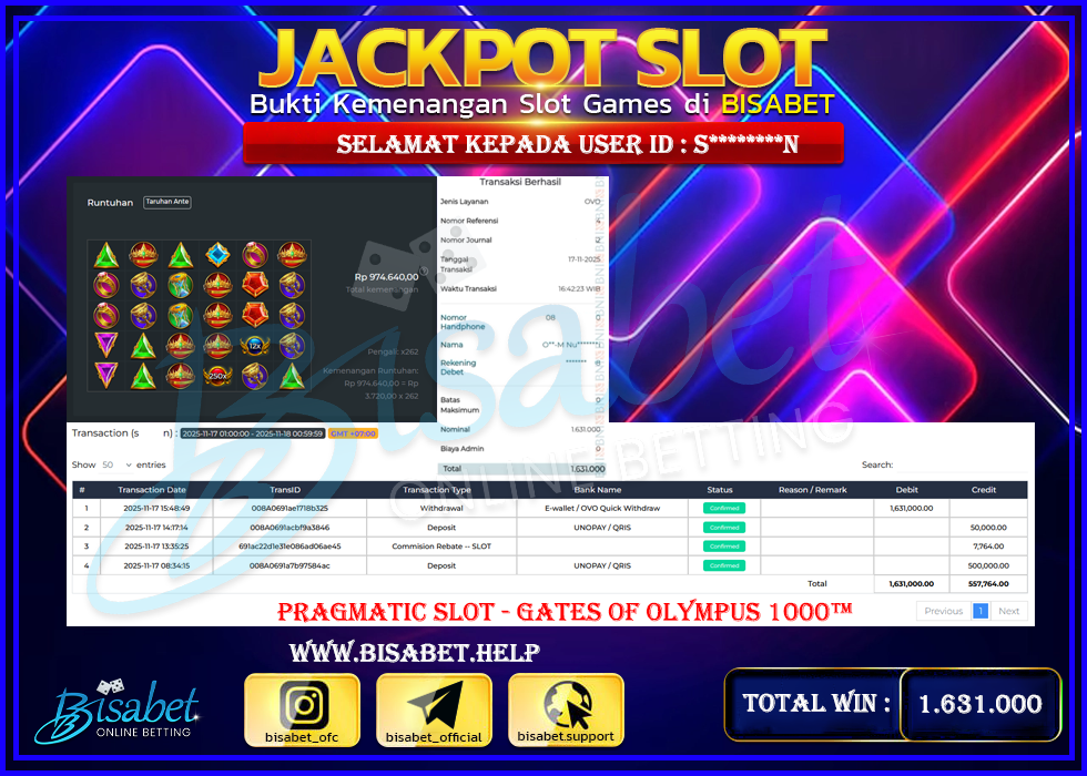 BUKTI JP BISABET – MEMBER DEPO 550 RIBU JADI 1,631 JUTA
