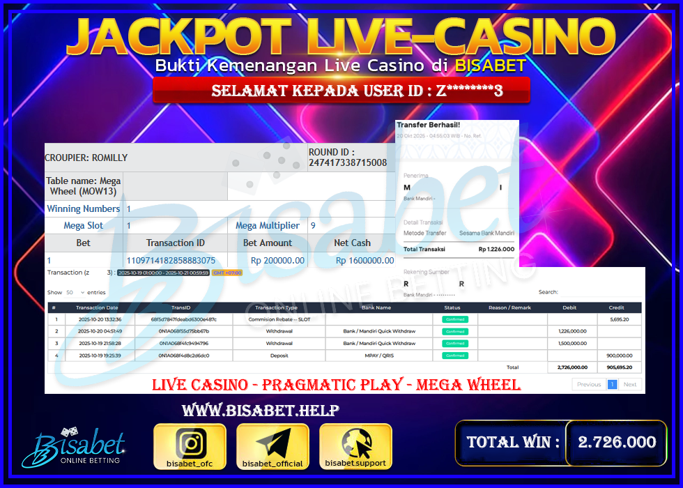 BUKTI JP BISABET – MEMBER DEPO 900 RIBU JADI 2,726 JUTA