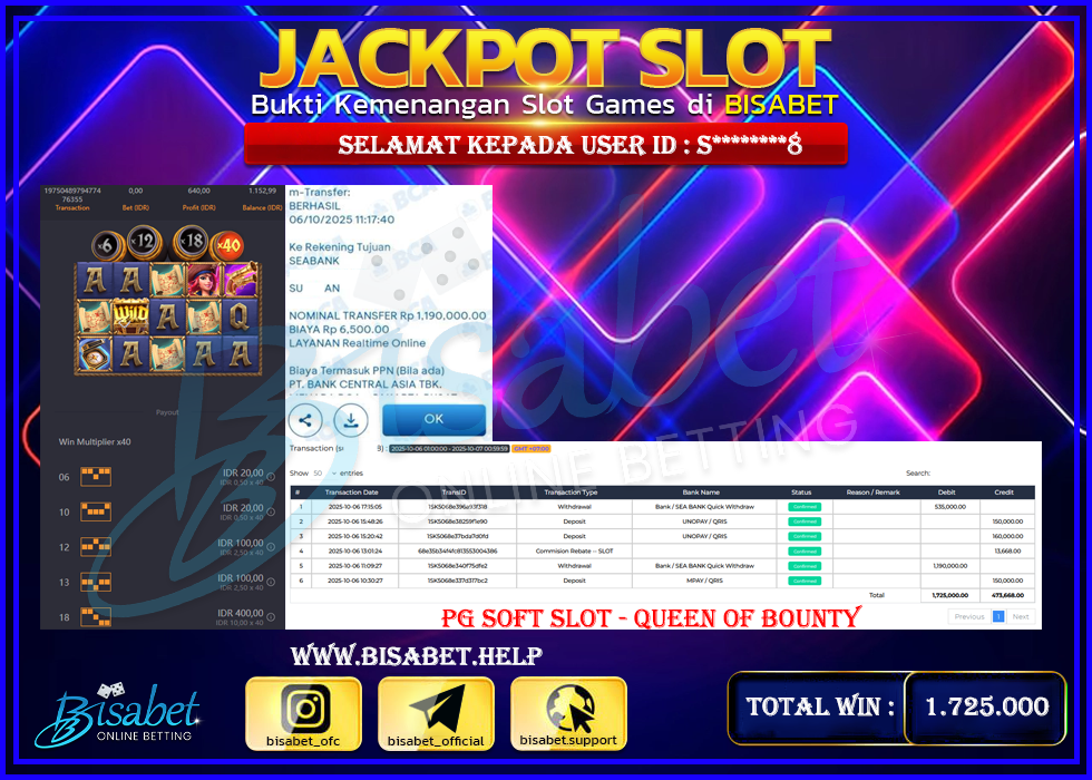 BUKTI JP BISABET – MEMBER DEPO DEPO 460 RIBU JADI 1,725 JUTA