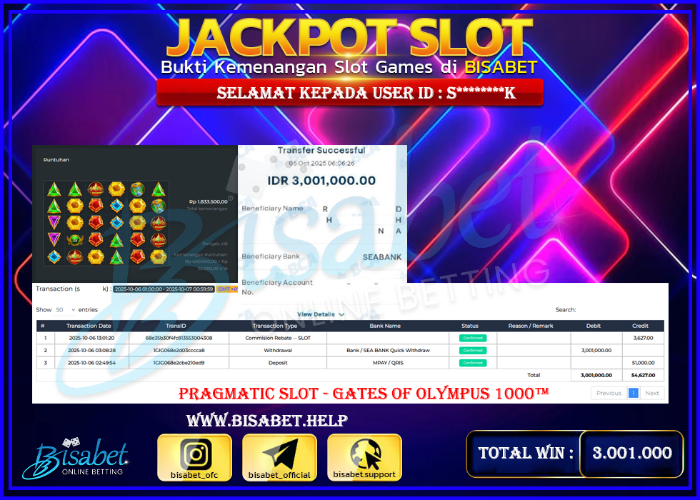 BUKTI JP BISABET – MEMBER DEPO DEPO 51 RIBU JADI 3,001 JUTA